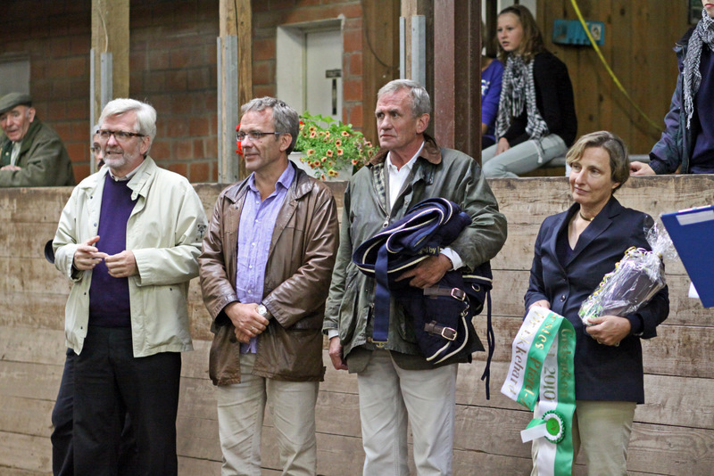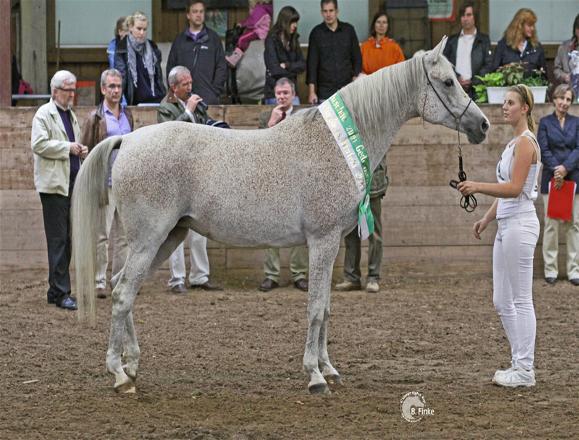 Nachdem aus den verschiedenen Klassen noch einmal alle Sieger gemeinsam in die Halle gebeten wurden um das beste Pferd der Schau heraus zu stellen war die Spannung groß. Immerhin waren mehrere sehr gute gekörte Hengste und Stuten der Arabischen Rassegruppen am Start. Der Zuchtleiter Diether von Kleist machte es mit seinem Kommentar sehr spannend um schließlich als bestes Pferd der Schau Kelissa vor zu stellen. Aber das sollte noch nicht alles sein Kelissa bekam den Sonderehrenpreis für den besten Shagya Araber der Schau von den Gebrüdern Frielinghaus mit sichtlicher Freude überreicht.Wir bedanken uns hiermit noch einmal herzlich bei Ihnen für den Sonderehrenpreis zum Gedenken an Ihren Vater Dr.Ekkehard Frielinghaus der ein herausragender Hippolloge war.,sowie bei Betty Finke und Roberto Ansorena für die wunderbaren Fotos unserer Pferde.
